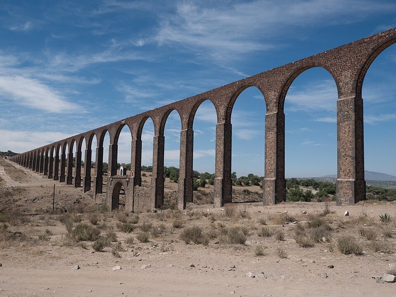 В штате Идальго, недалеко от города Тепеапулько, можно увидеть внушительное гидротехническое сооружение колониальной эпохи. Это акведук, построенный по проекту францисканского монаха. Его конструкция включает в себя арки разной высоты, которые пересекают равнину и глубокий овраг. Каменная кладка из тёмно-розового и серого камня создаёт чёткий геометрический рисунок, особенно заметный на рассвете. Сооружение тянется на большое расстояние, и с некоторых точек видны сразу два его яруса, уходящие к горизонту.