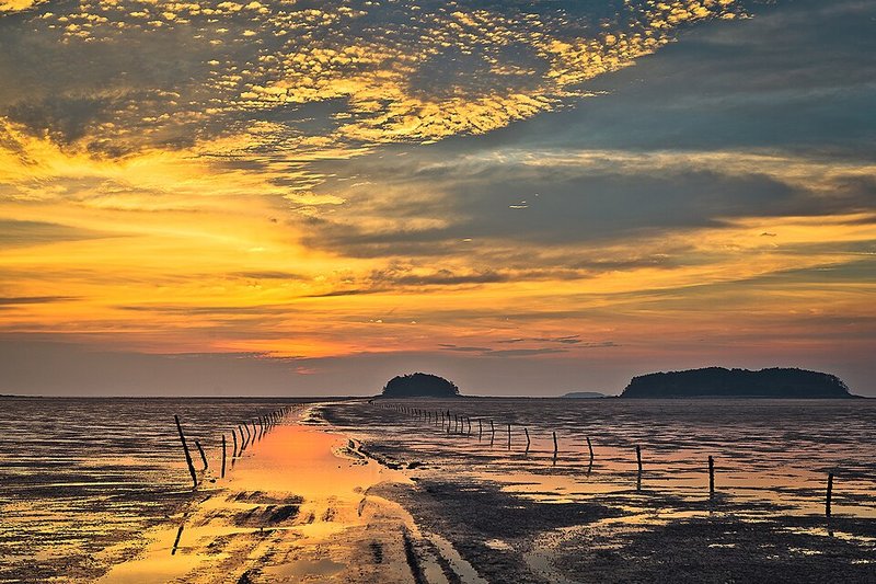 Чтобы понять масштаб гетбол, лучше всего посетить их во время отлива. Можно пройти по деревянным настилам, которые построены для посетителей. Советую надеть обувь, которую не жалко испачкать, или просто ходить босиком. Закат здесь имеет особый характер — низкое солнце отражается в бесчисленных лужицах, оставленных отступившей водой, окрашивая все в теплые тона. Это место демонстрирует, как человек и природа могут сосуществовать, сохраняя хрупкий баланс.